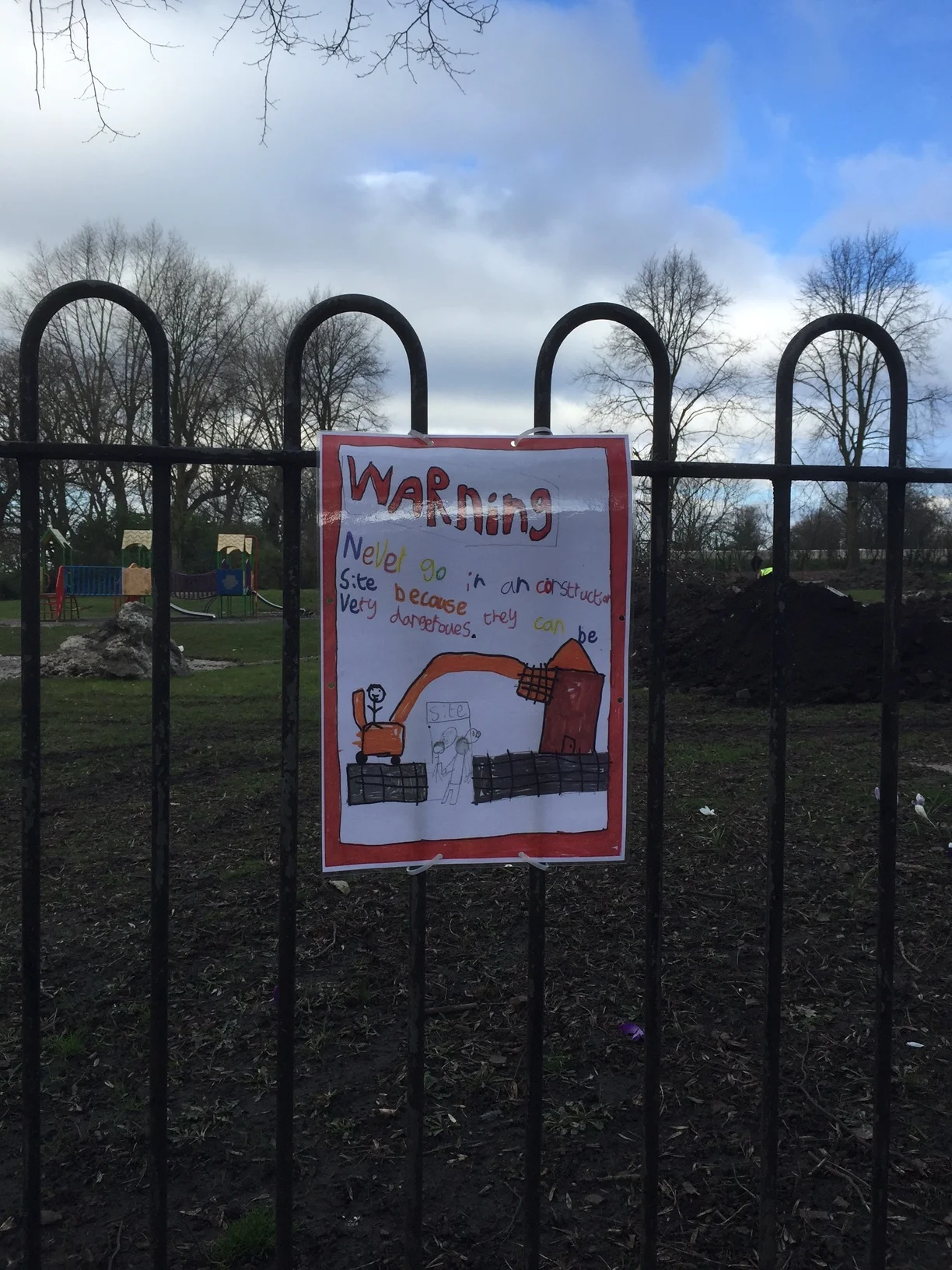 The play area was closed for the duration of the works. We organised a competition for Year 1 and Year 2 pupils from Light Oaks Infant School to design a poster to warn other children not to enter the building site. We were very impressed with the posters and it was difficult to choose the winners but after a lot of deliberation we displayed the 3 winning posters from each class on site.