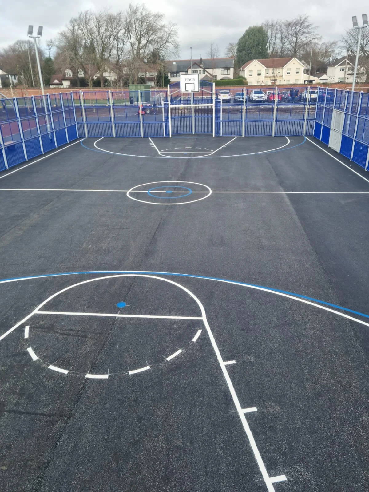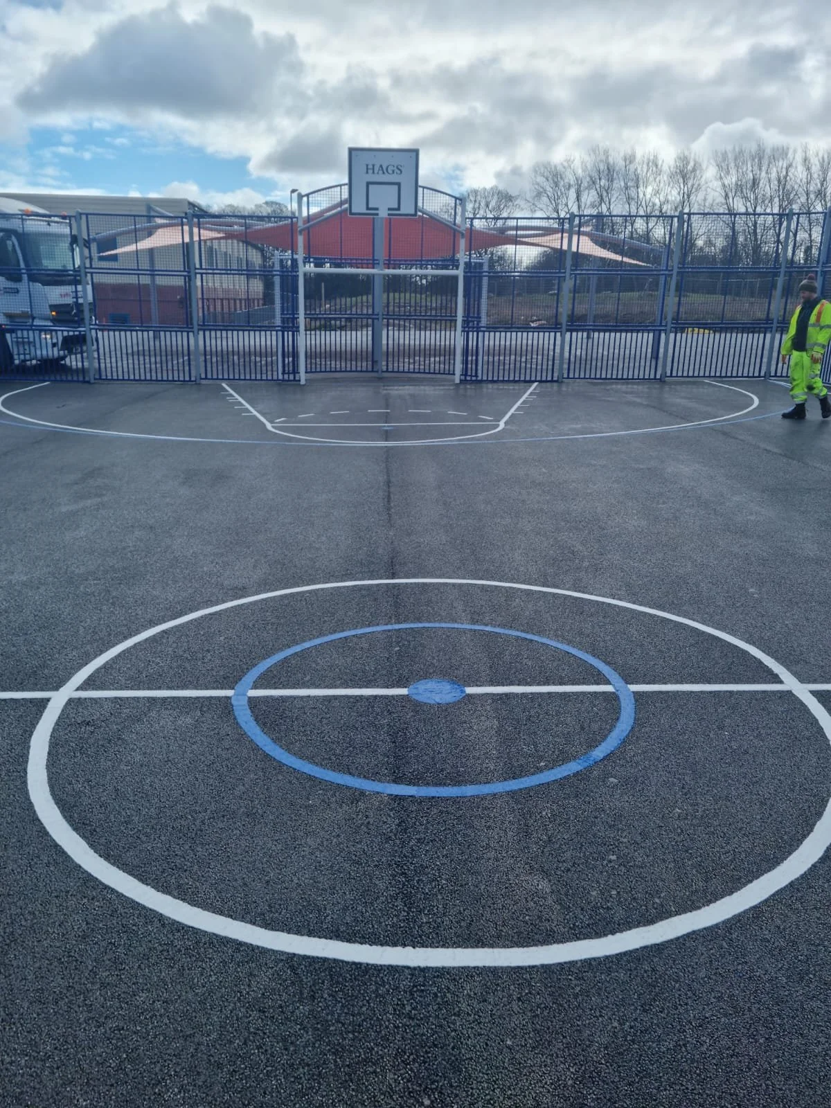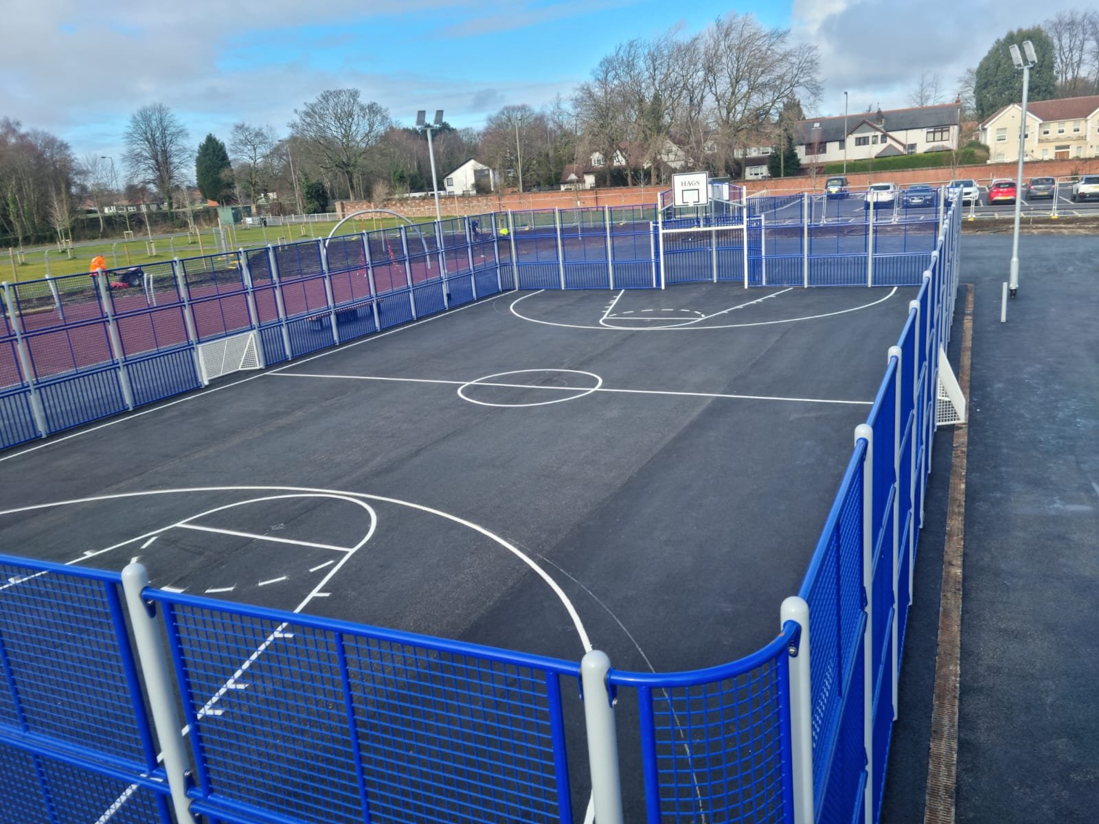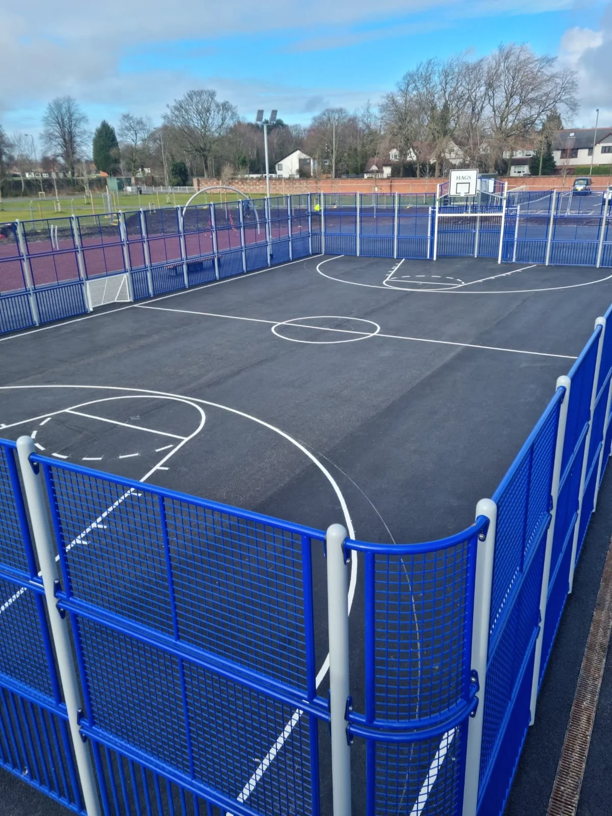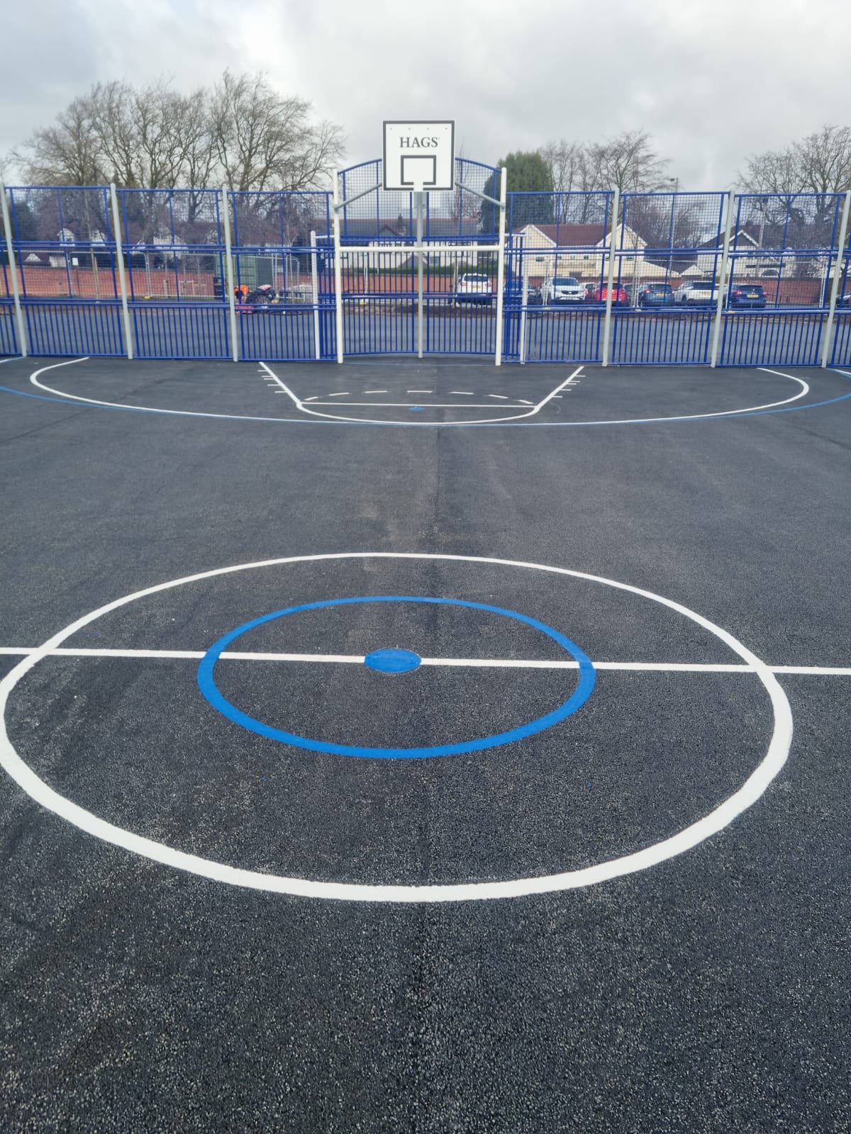 A HAGS MUGA with Football and Basketball goal ends was installed with a tarmac surface. An ACO drain was installed that drains to an attenuation tank under the adjacent car park. Floodlighting allows the MUGA to be used until 10pm year round and street furniture provides rest areas.